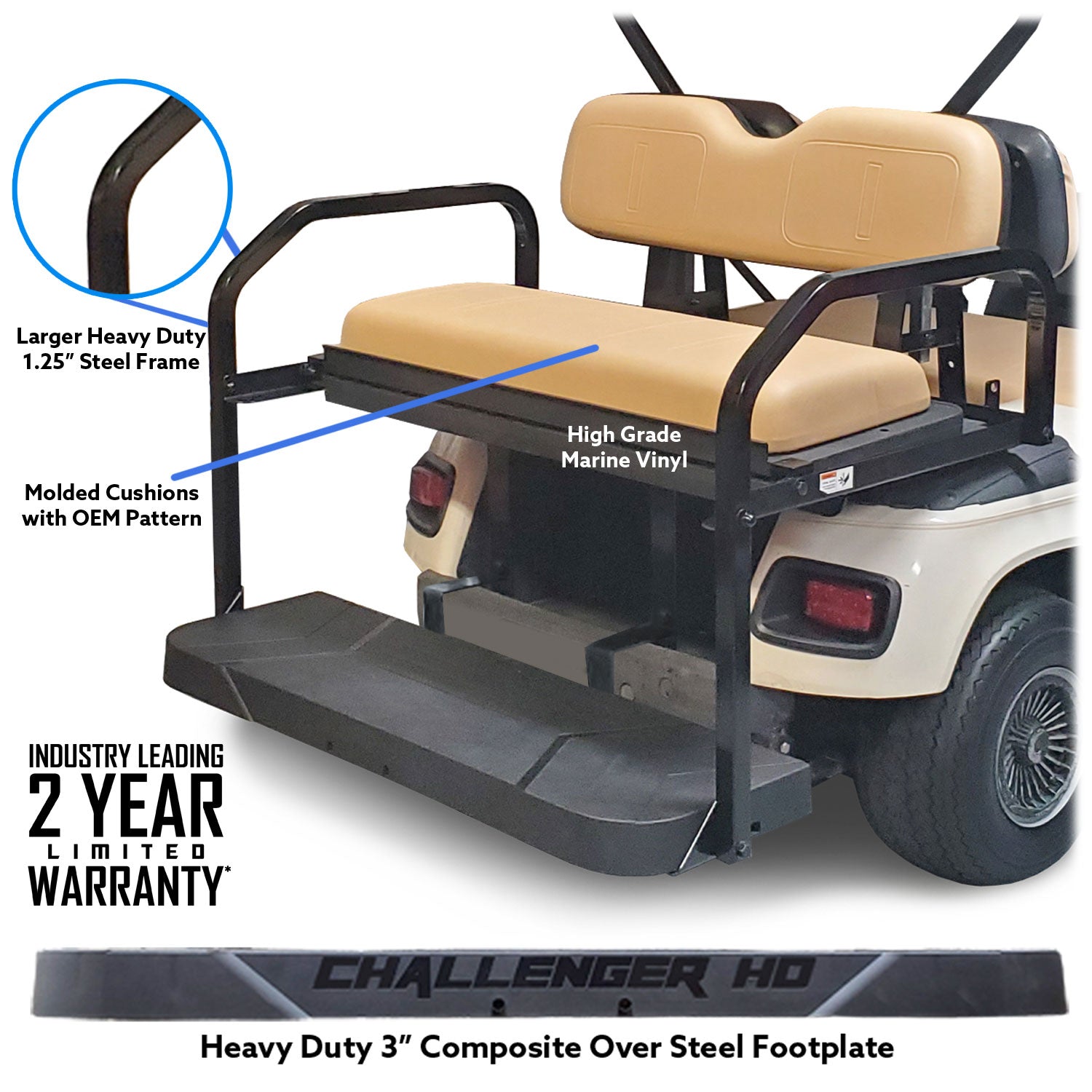 Are you looking for the best golf cart rear seat kit on the market for your EZGO TXT? These Challenger HD Rear Seat Kits from ProFormX bring a new meaning to the term "heavy duty"! One of the only golf cart rear seat kits on the market to use 1.25" arms rails give this rear seat kit the strength you are looking for. Our exclusive molded footrest design with steel re-enforcement will handle the heaviest of loads. Quickly and easily flip the rear seat to convert your cart in to a load carrying utility vehicle. Our golf cart rear seat kit even includes a built in access door that can be equipped with the optional storage tub to give you even more storage space. These Challenger HD golf cart rear seat kits also come with built in seat belt mounting locations, so you can easily install rear seat belts and our optional rear grab bar to make these rear seat kits even safer when hauling young passengers.