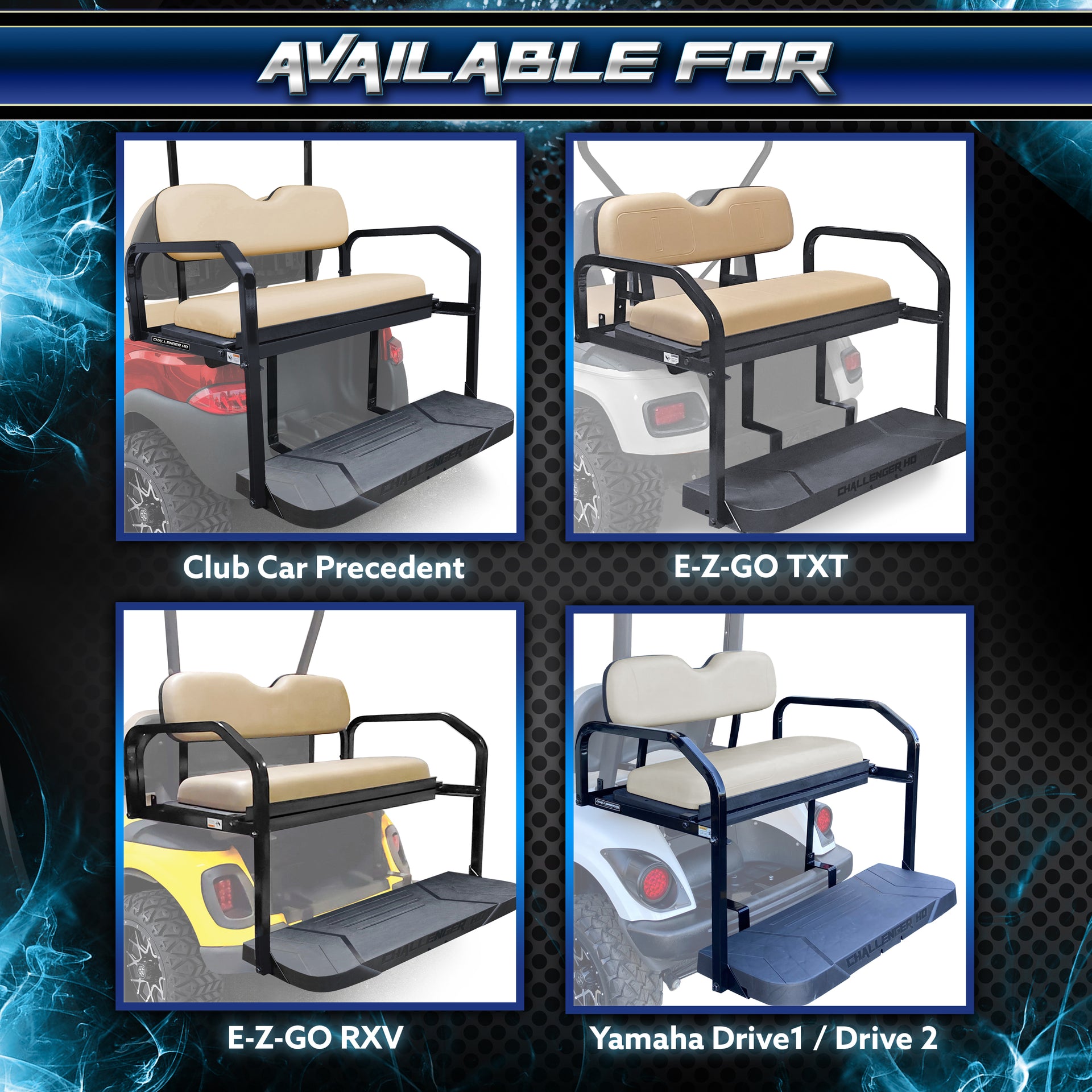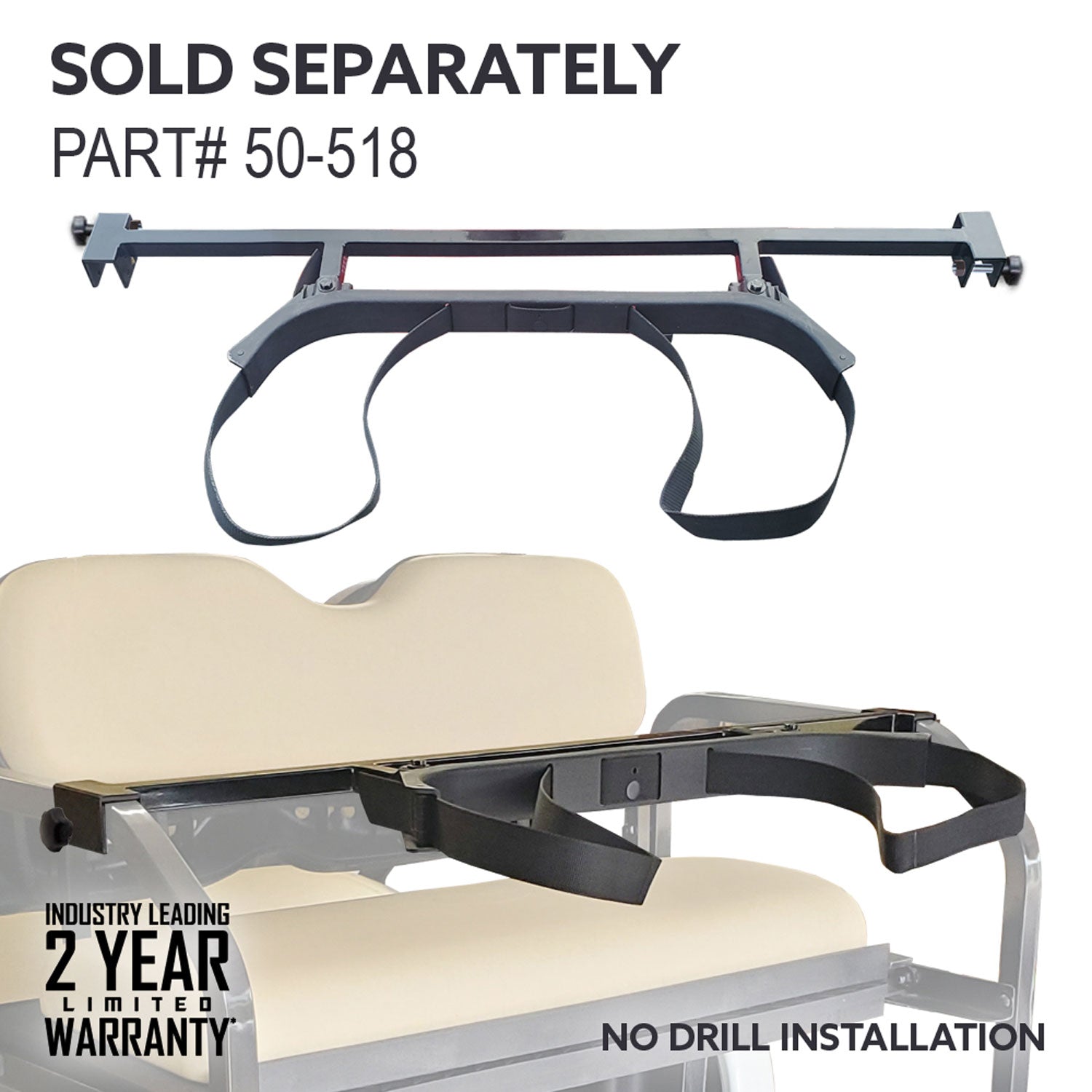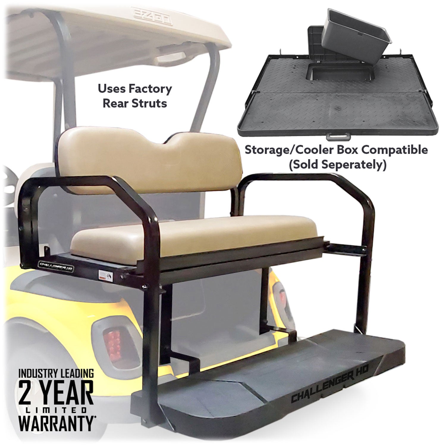 Are you looking for the best golf cart rear seat kit on the market for your EZGO RXV? These Challenger HD Rear Seat Kits from ProFormX bring a new meaning to the term "heavy duty"! One of the only golf cart rear seat kits on the market to use 1.25" arms rails give this rear seat kit the strength you are looking for. Our exclusive molded footrest design with steel re-enforcement will handle the heaviest of loads. Quickly and easily flip the rear seat to convert your cart in to a load carrying utility vehicle. Our golf cart rear seat kit even includes a built in access door that can be equipped with the optional storage tub to give you even more storage space. These Challenger HD golf cart rear seat kits also come with built in seat belt mounting locations, so you can easily install rear seat belts and our optional rear grab bar to make these rear seat kits even safer when hauling young passengers.