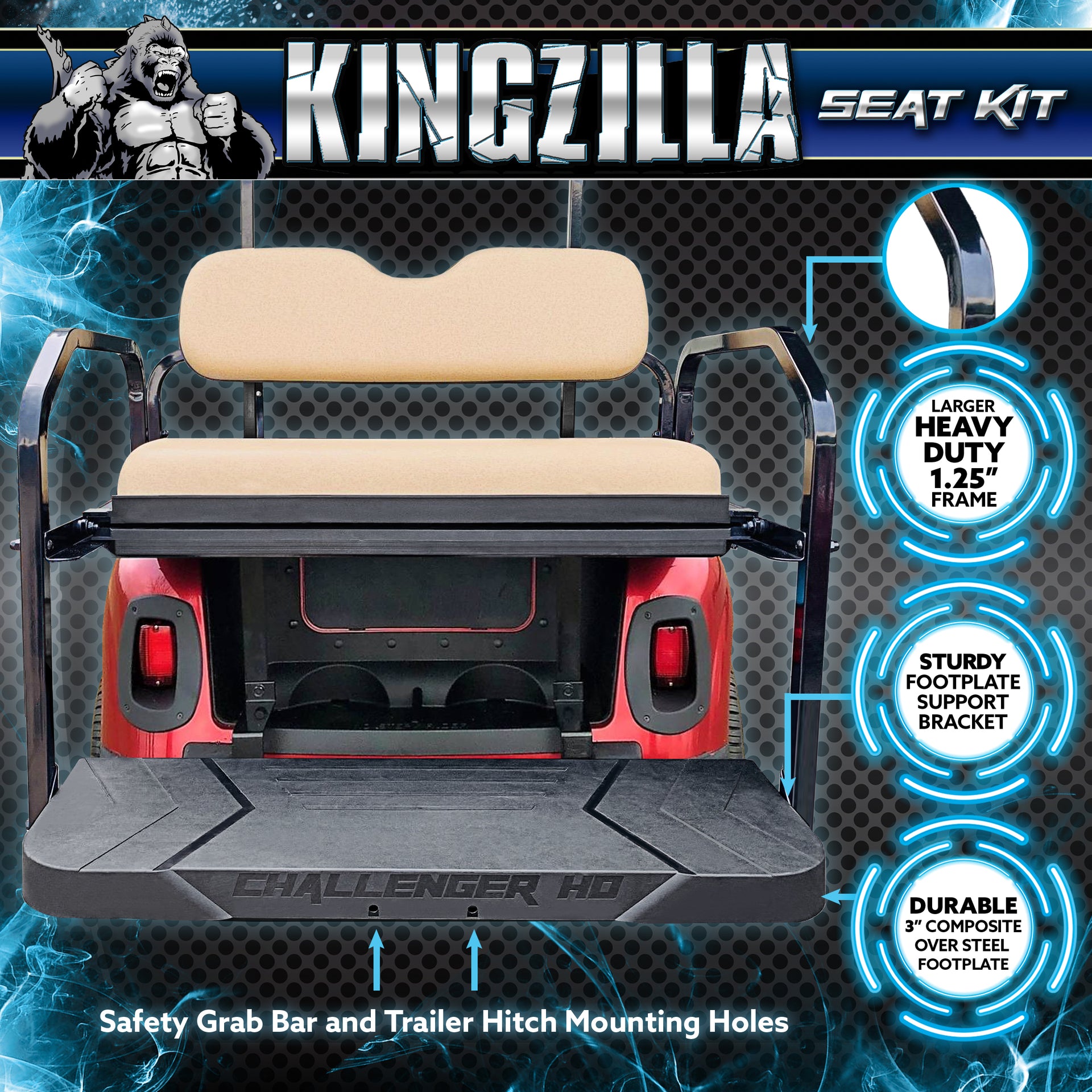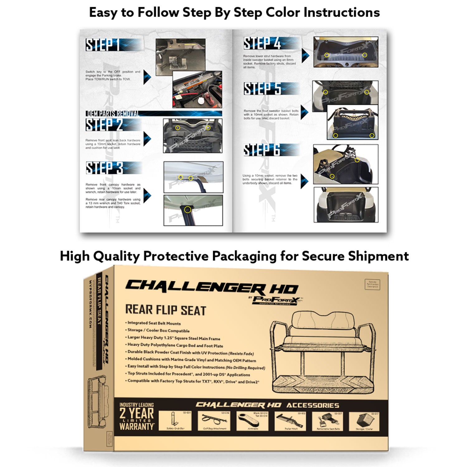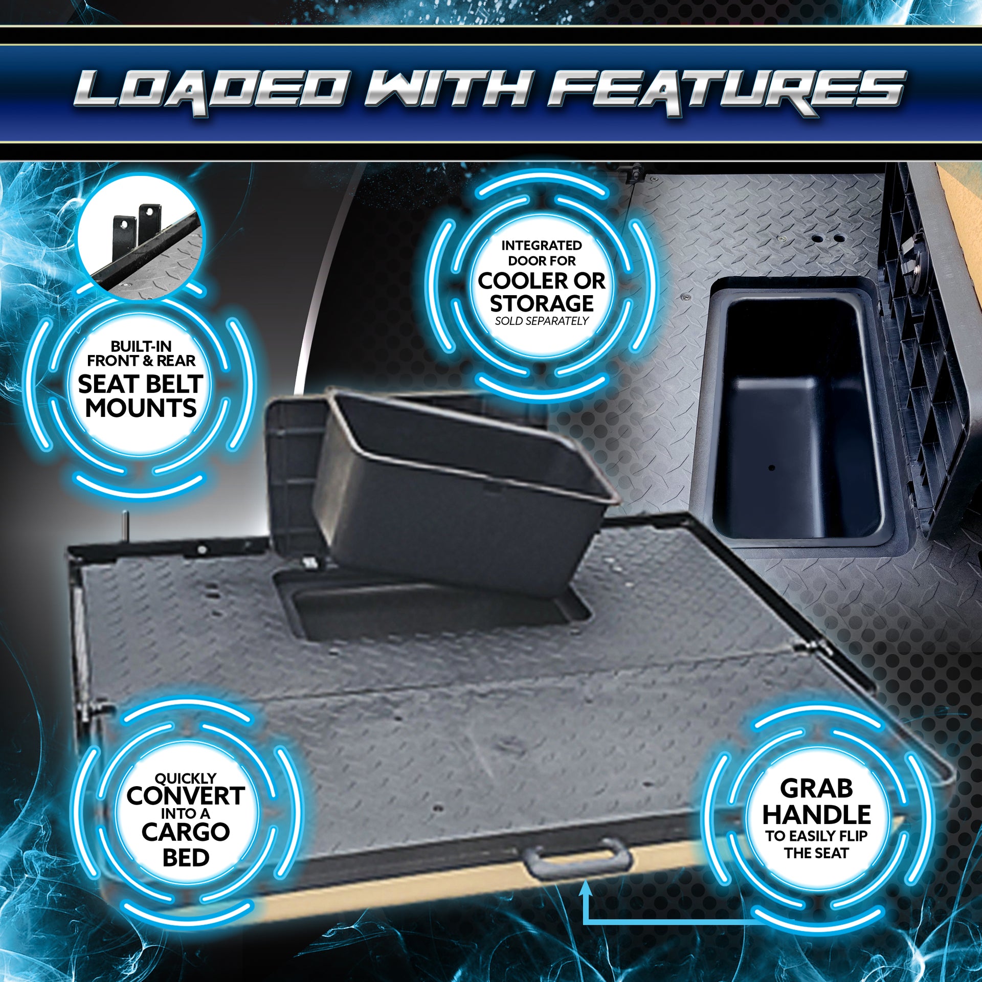 Are you looking for the best golf cart rear seat kit on the market for your EZGO RXV? These Challenger HD Rear Seat Kits from ProFormX bring a new meaning to the term "heavy duty"! One of the only golf cart rear seat kits on the market to use 1.25" arms rails give this rear seat kit the strength you are looking for. Our exclusive molded footrest design with steel re-enforcement will handle the heaviest of loads. Quickly and easily flip the rear seat to convert your cart in to a load carrying utility vehicle. Our golf cart rear seat kit even includes a built in access door that can be equipped with the optional storage tub to give you even more storage space. These Challenger HD golf cart rear seat kits also come with built in seat belt mounting locations, so you can easily install rear seat belts and our optional rear grab bar to make these rear seat kits even safer when hauling young passengers.