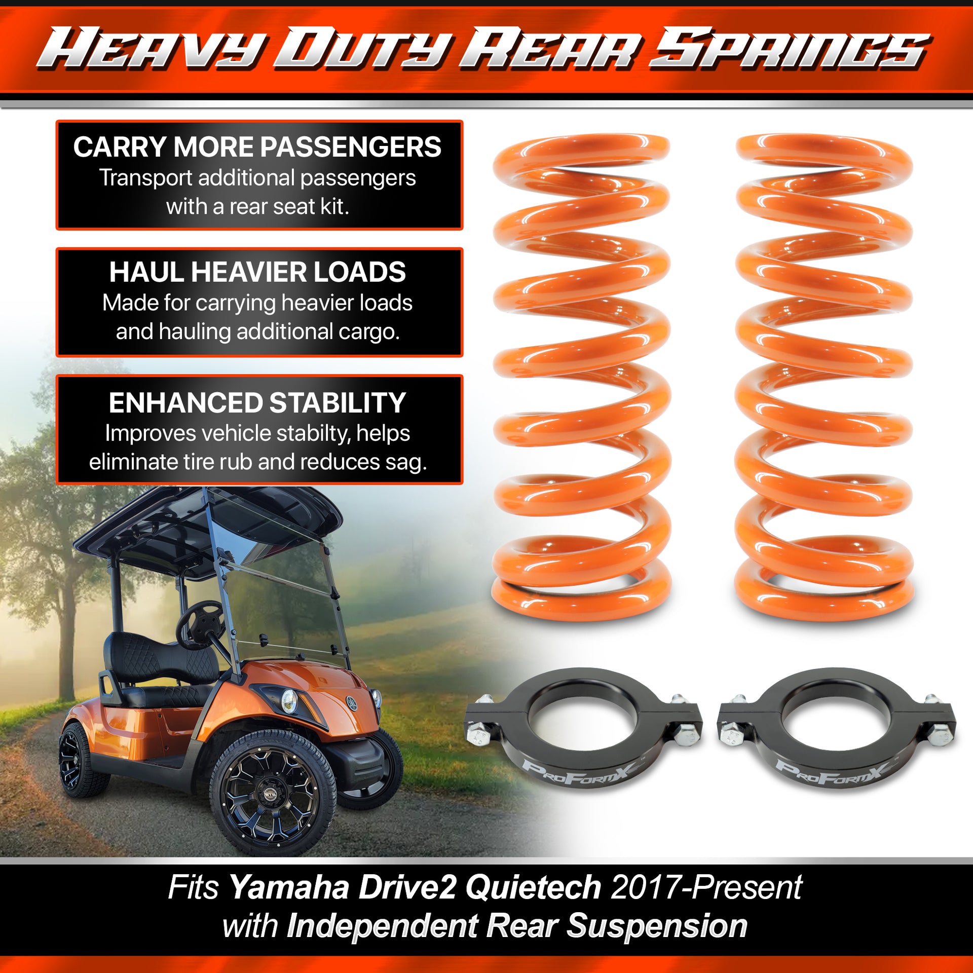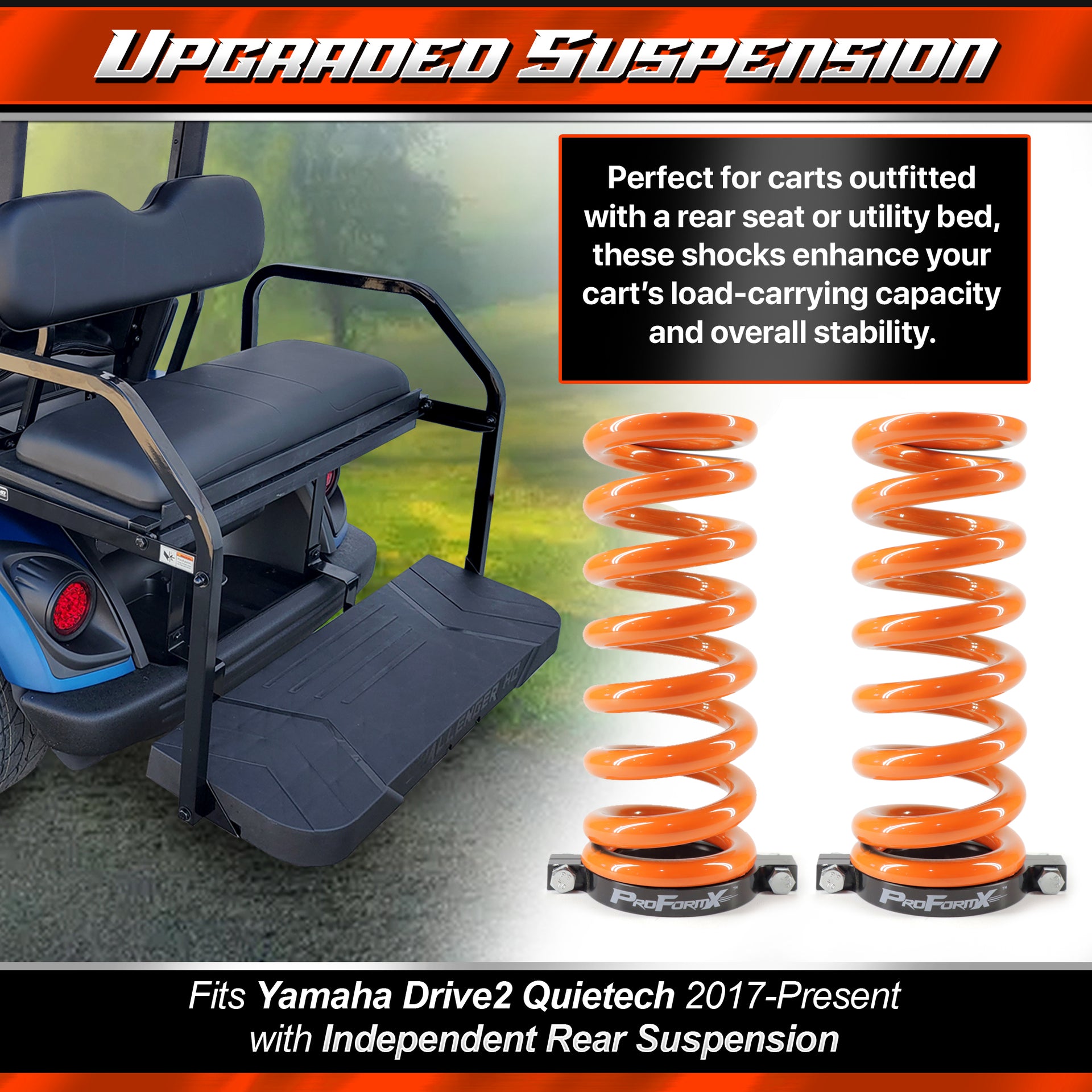 Upgrade your Yamaha Drive2 Quietech (2017 and newer) with our ProFormX Heavy Duty Rear Springs, designed specifically for models with independent rear suspension. Perfect for carts outfitted with a rear seat or utility bed, these shocks enhance your cart’s load-carrying capacity and overall stability.